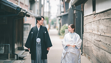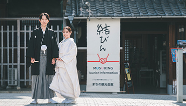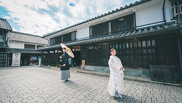 歴史的建物が並ぶ街で、和装にぴったりのロケーションです。