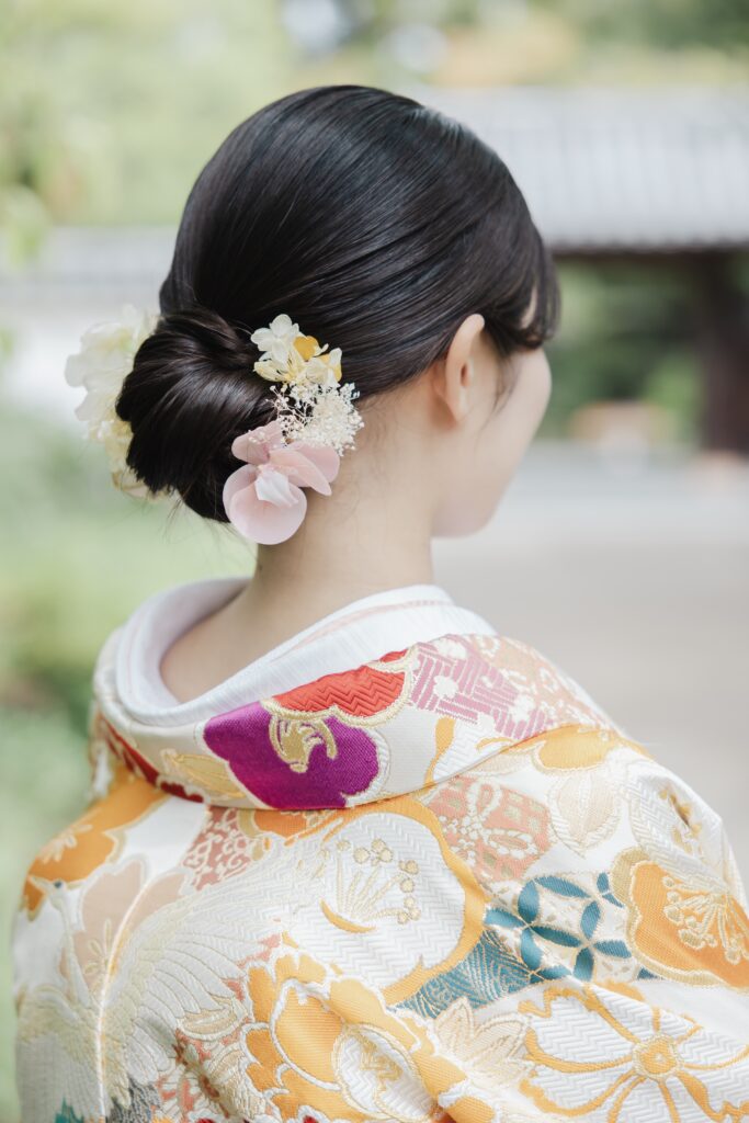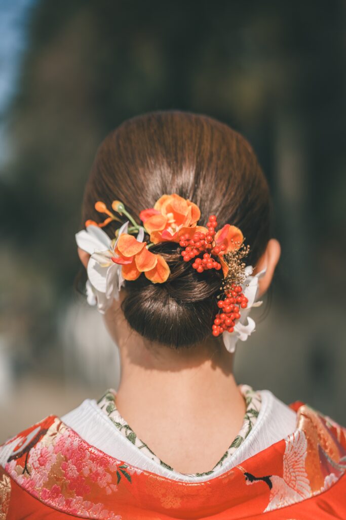 お着物の色味と合わせて白やオレンジを少しプラスして
